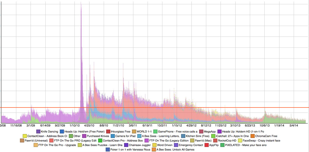 When the iPad first came out, we did a new FTP On The Go PRO version which is the big pink section starting in 2010; and at the tail end in 2013 the orange and purples are the Discounted Upgrade versions we did when changing to iOS 7.